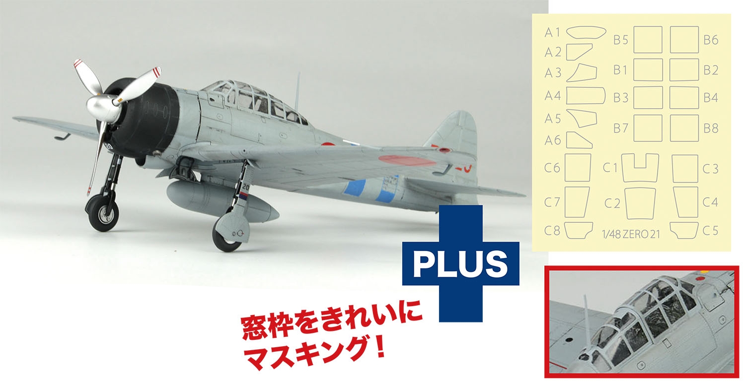 初期タイプのA6M2、二一型をモデル化しています。加えてこのキットにはキャノピーのフレームを塗装する便利なマスクシートが付属。