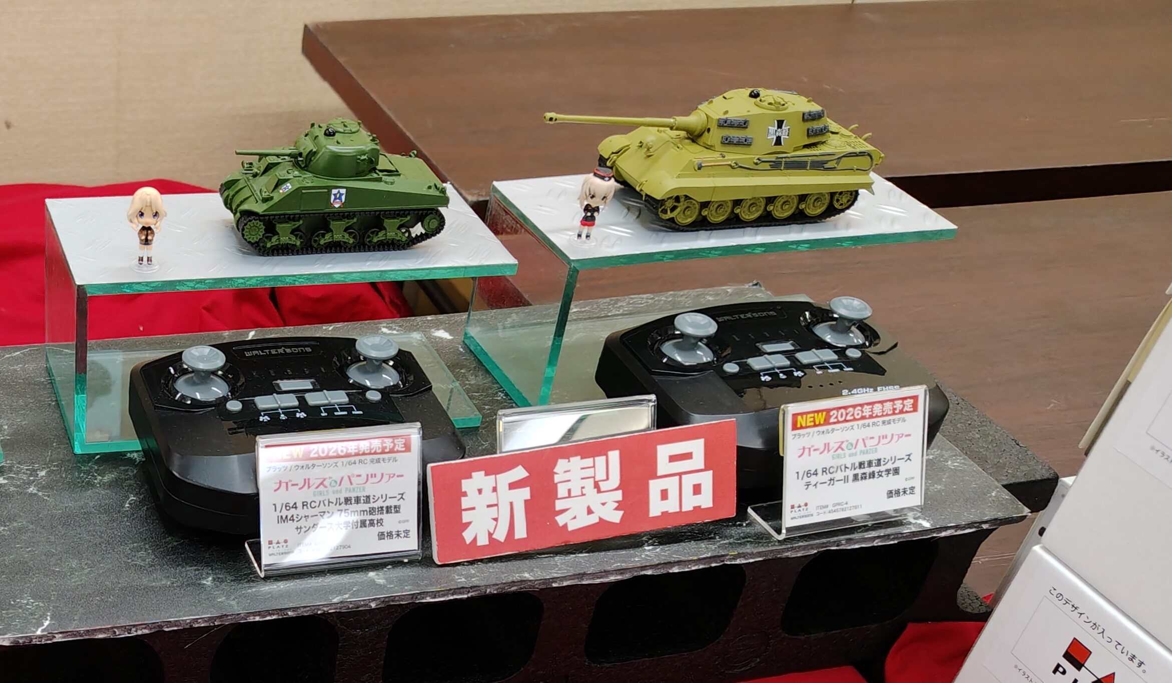 商品化進行中のRCバトル戦車道シリーズの新製品「M4シャーマン75mm砲登載型サンダース大学付属高校」と「ティーガーII 黒森峰女学園」の展示も行いました。
