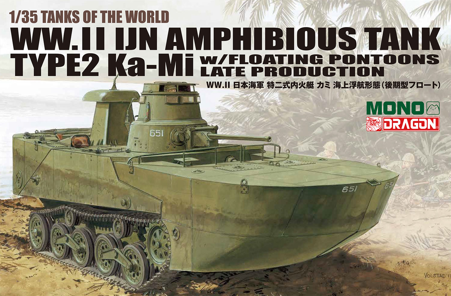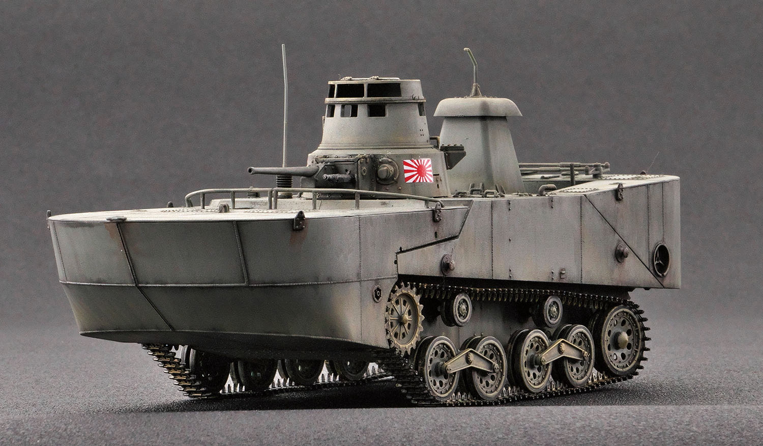 第二次世界大戦で日本海軍が陸戦隊の装備として開発した水陸両用戦車、特二式内火艇カミを再現した1/35スケールのプラモデルキットです。前後フロートの形状や取付具のディテール、砲塔上面の展望塔や機関室上面の通気筒など細かな装備もしっかりと再現されています。今一番オススメしたい戦車キットです!
